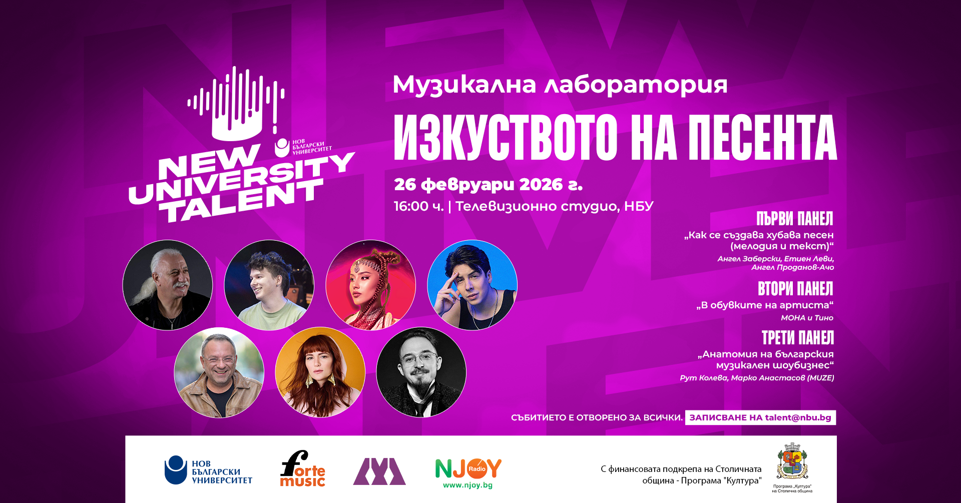 На 26 февруари 2026 г. от 16:00 до 18:00 ч. в телевизионното студио на Нов български университет ще се проведе Музикална лаборатория „Изкуството на песента“ - публична дискусия в рамките на третото издание на конкурса за нова авторска песен „New University Talent“. Събитието е отворено за всички автори, изпълнители, студенти и любители на музиката, които искат да надникнат зад кулисите на създаването на една успешна песен и да научат повече за реалностите на българския музикален шоубизнес.
